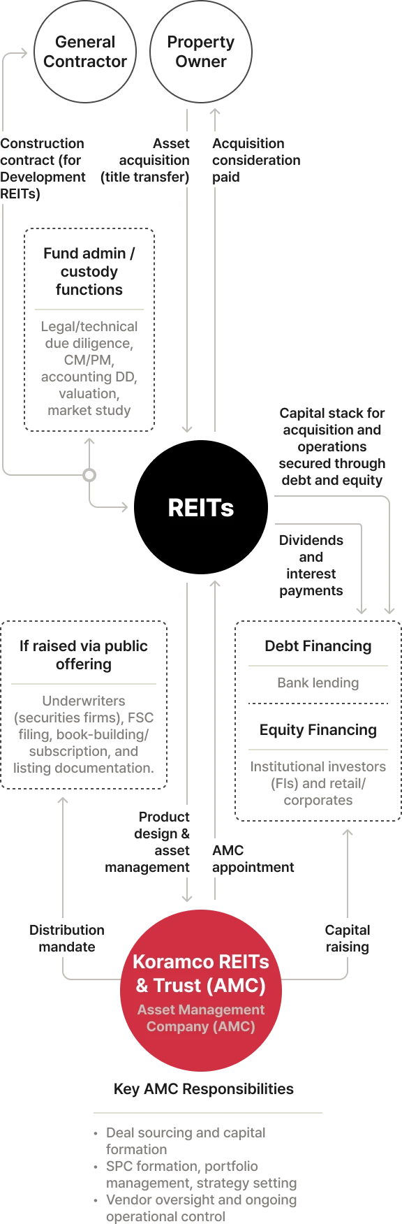 A development REIT can act as the nominal developer/borrower (SPC), with conditional forward-purchase structures allowing contractors/developers to sell all or part under completion terms, funding project costs via the REIT’s pre-acquisition.