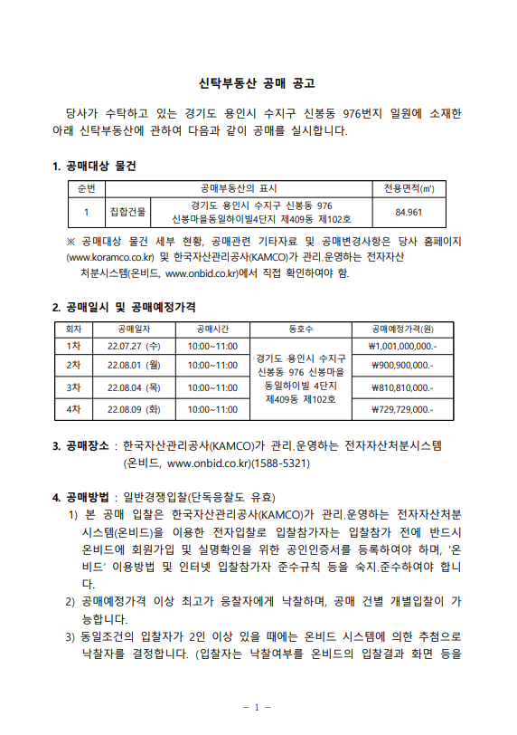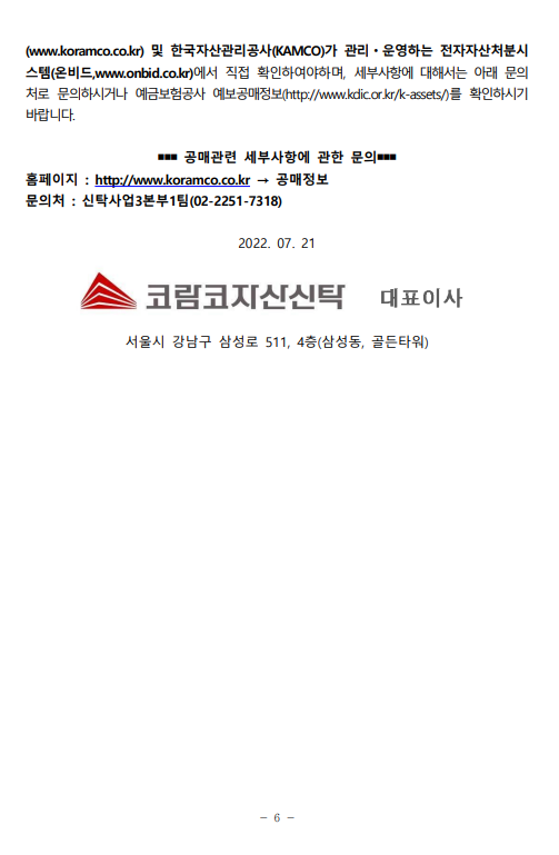 - 당사((주)코람코자산신탁) 홈페이지 내 '공매정보'를 참고하여 주시기 바랍니다..
