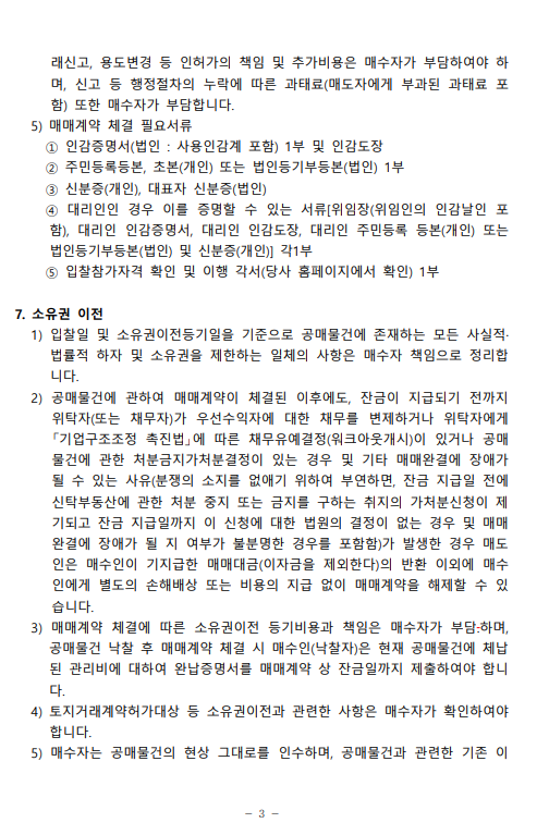 - 첨부파일의 매매계약서(안), 공매공고 및 입찰참가자 준수규칙 등을 반드시 확인하여 주시기 바랍니다.