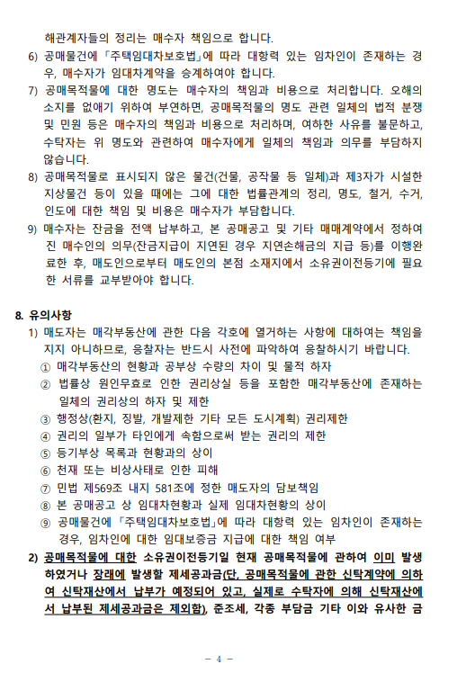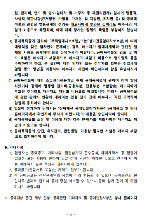 ※ 당사는 등기부상 최초 1회에 한하여 소유권 이전등기 업무만을 수행하고 이를 제외한 매매계약과 관련한 매도인으로서의 일체의 의무 및 책임(매매목적물의 모든 법률적·사실적 하자 또는 장애에 대한 매도인으로서의 의무 및 책임, 불법행위책임, 채무불이행책임 및 하자담보책임을 포함하되 이에 한정되지 않음)을 부담하지 않음을 안내드립니다. (자세한 사항은 첨부의 공매 공고, 매매계약서(안) 및 당사 홈페이지 '공매정보' 참조).