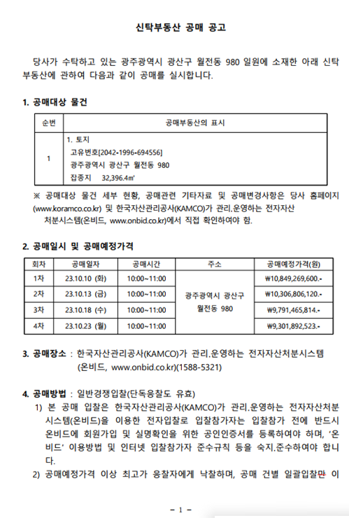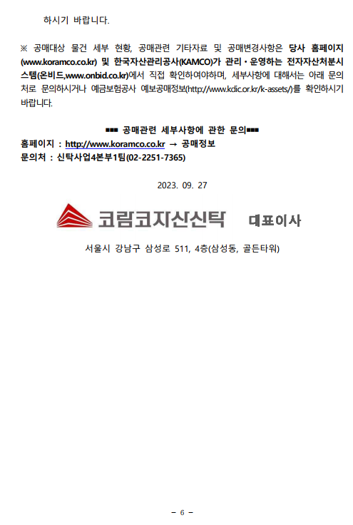 - 당사((주)코람코자산신탁) 홈페이지 내 '공매정보'를 참고하여 주시기 바랍니다.