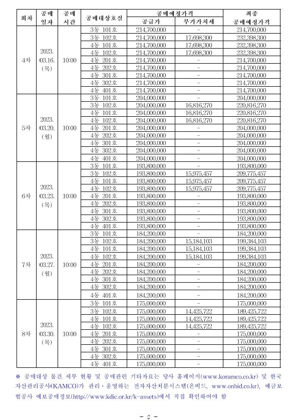 - 공매장소 : 한국자산관리공사(KAMCO)가 관리·운영하는 전자자산처분시스템 (온비드, www.onbid.co.kr)(1588-5321)