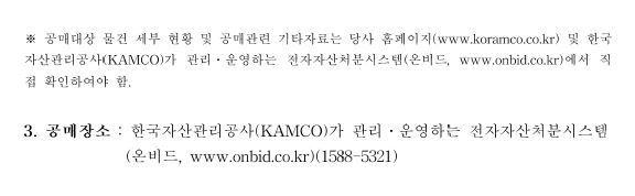 - 공매장소 : 한국자산관리공사(KAMCO)가 관리·운영하는 전자자산처분시스템 (온비드, www.onbid.co.kr)(1588-5321)