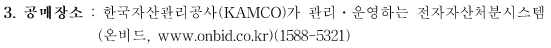 - 공매공고 및 입찰참가자 준수규칙 등을 한국자산관리공사(KAMCO)가 관리ㆍ운영하는 전자자산처분시스템(온비드, www.onbid.co.kr)에서 반드시 확인하여 주시기 바랍니다. - 공매장소 : 한국자산관리공사(KAMCO)가 관리·운영하는 전자자산처분시스템 (온비드, www.onbid.co.kr)(1588-5321)