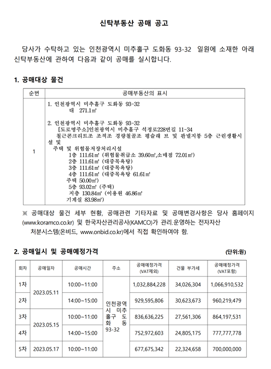 유찰 인천광역시 미추홀구 도화동 93-32 근린생활시설 토지 및 건물 일괄공매(재공매)