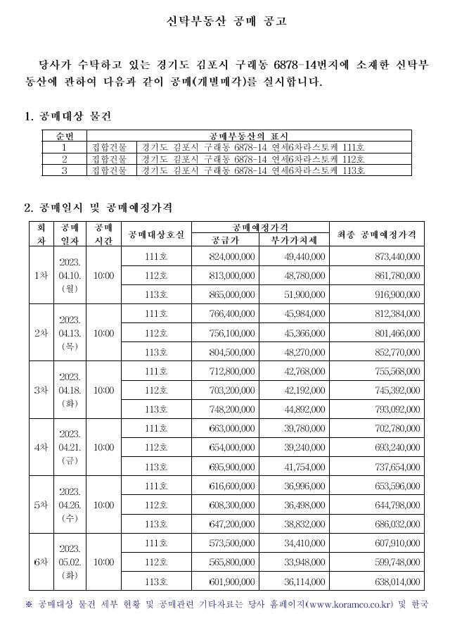 유찰 경기 김포시 구래동 6878-14 연세6차라스토케 111호, 112호, 113호 개별매각