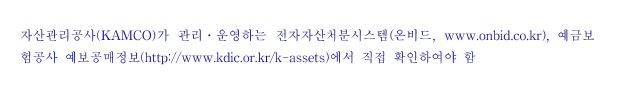 - 공매공고 및 입찰참가자 준수규칙 등을 한국자산관리공사(KAMCO)가 관리ㆍ운영하는 전자자산처분시스템(온비드, www.onbid.co.kr)에서 반드시 확인하여 주시기 바랍니다.