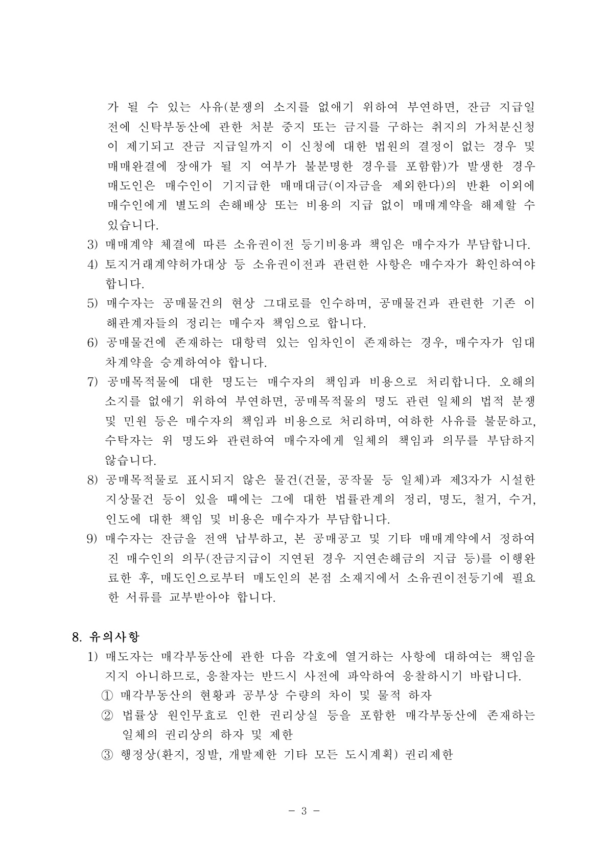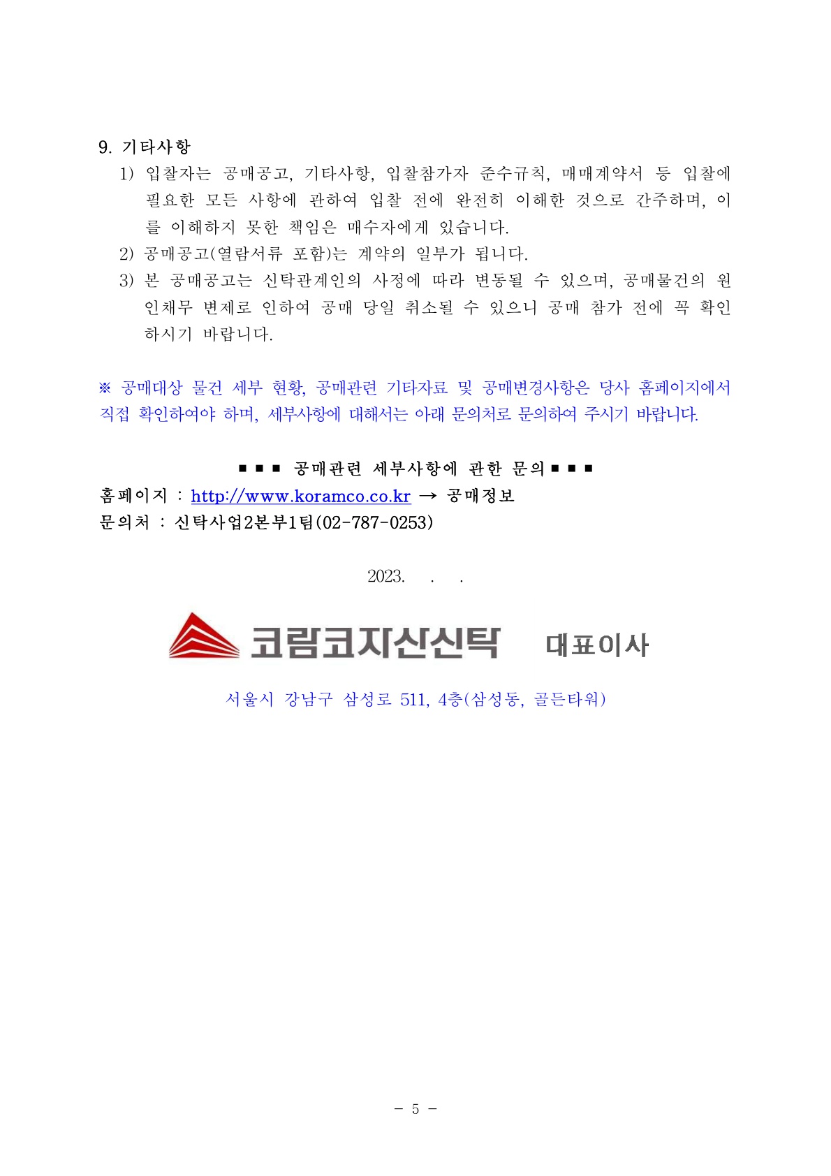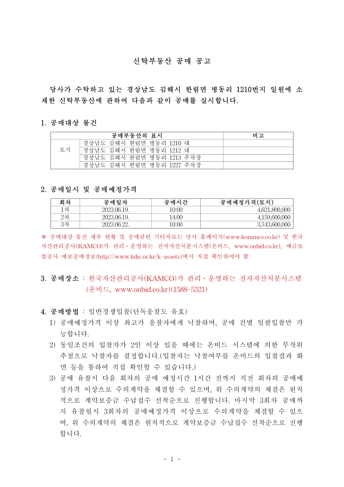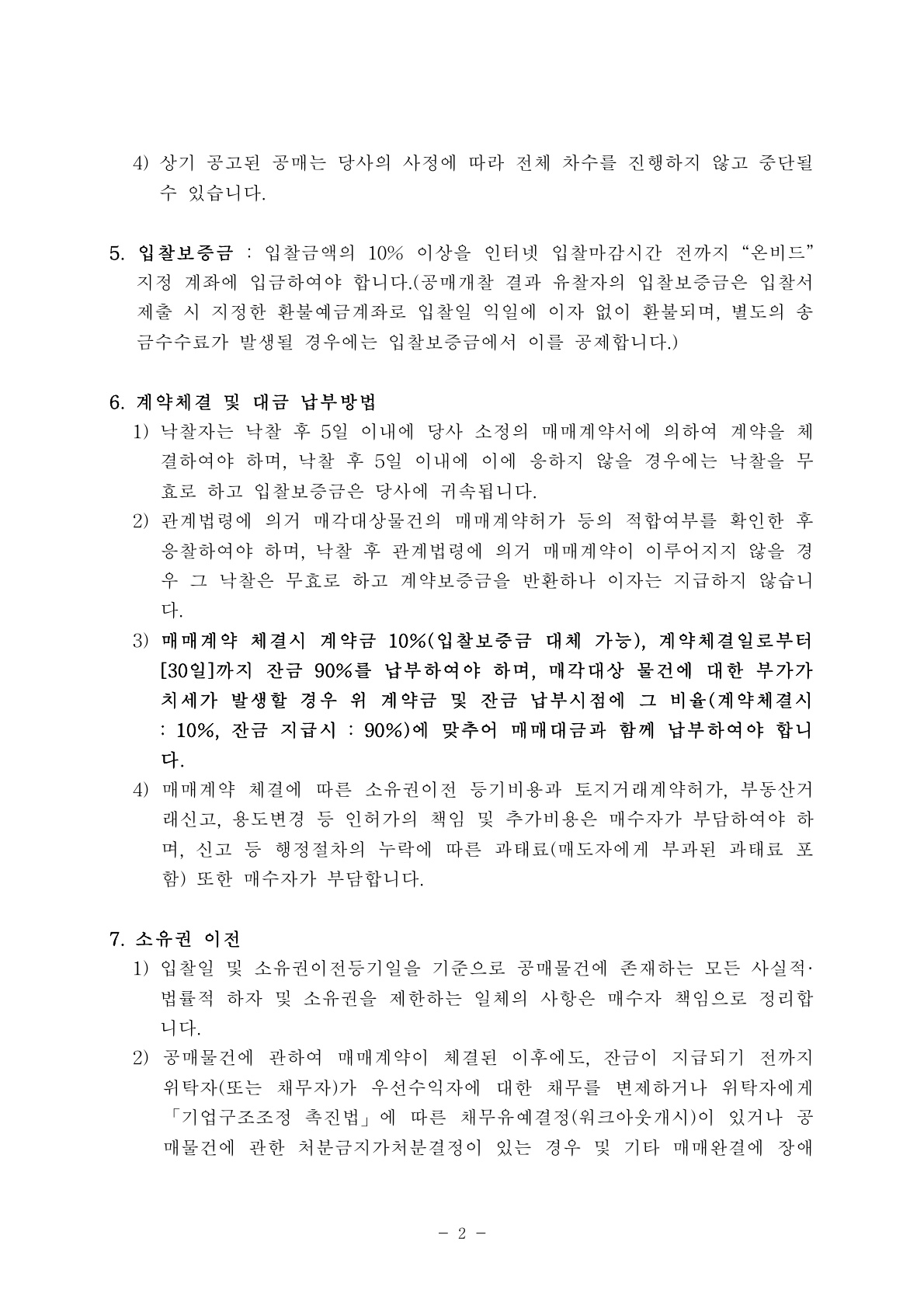 - 공매장소 : 한국자산관리공사(KAMCO)가 관리·운영하는 전자자산처분시스템 (온비드, www.onbid.co.kr)(1588-5321)