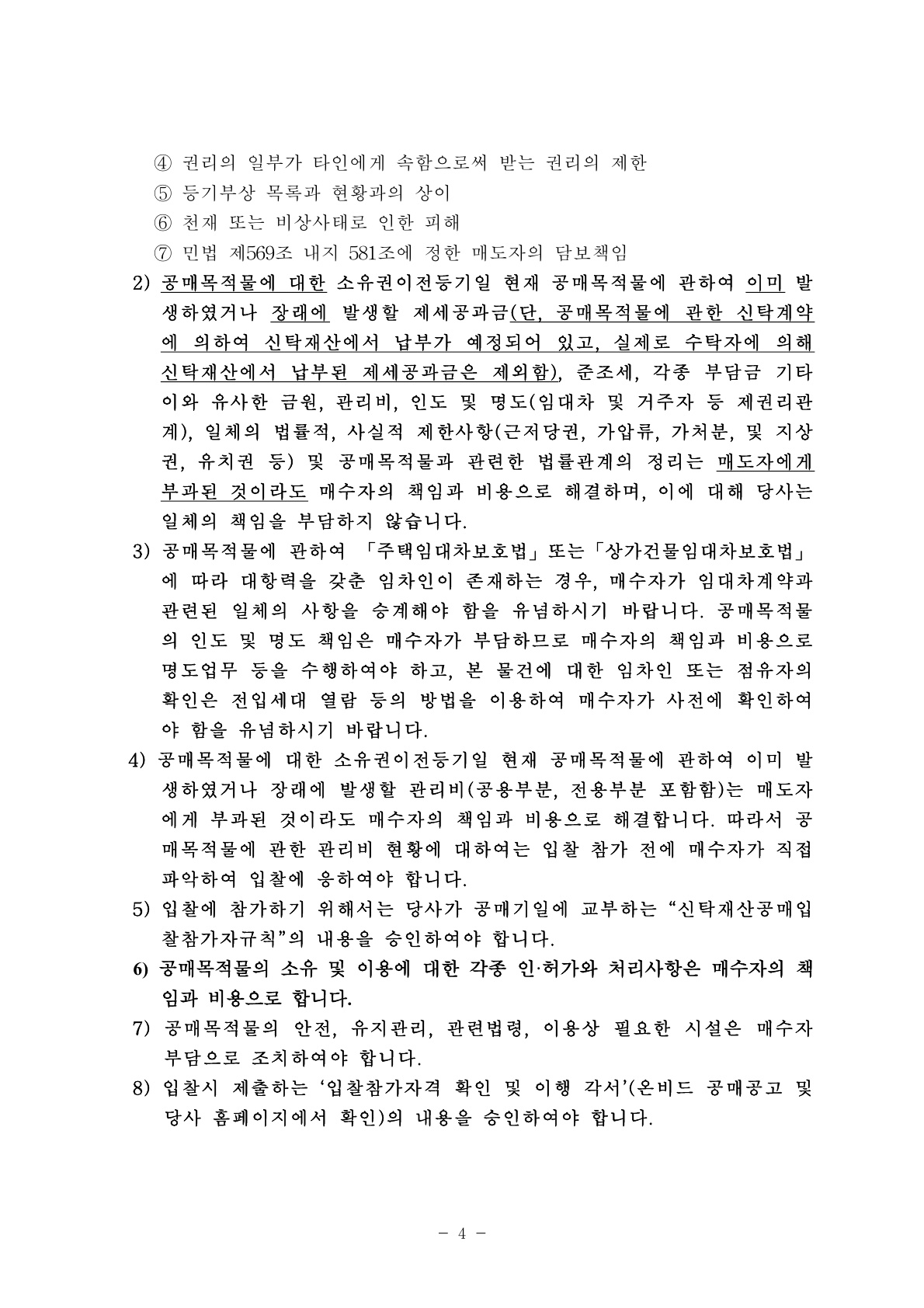 - 공매공고 및 입찰참가자 준수규칙 등을 한국자산관리공사(KAMCO)가 관리ㆍ운영하는 전자자산처분시스템(온비드, www.onbid.co.kr)에서 반드시 확인하여 주시기 바랍니다.