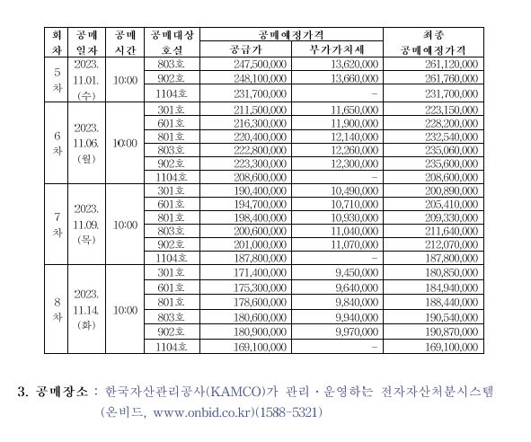 - 공매장소 : 한국자산관리공사(KAMCO)가 관리·운영하는 전자자산처분시스템 (온비드, www.onbid.co.kr)(1588-5321)
