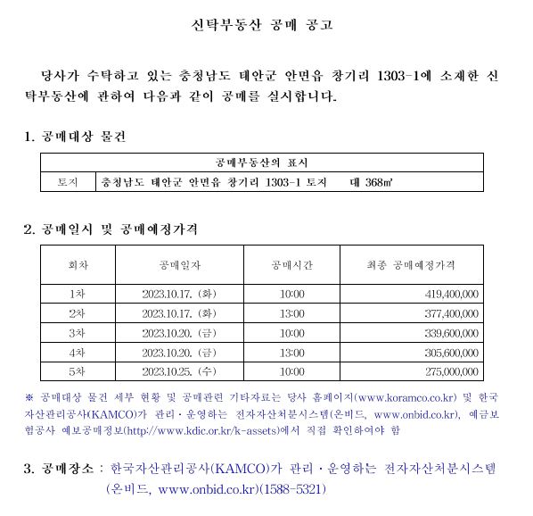 - 공매장소 : 한국자산관리공사(KAMCO)가 관리·운영하는 전자자산처분시스템 (온비드, www.onbid.co.kr)(1588-5321)