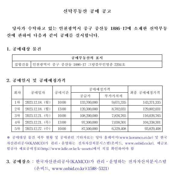 - 공매장소 : 한국자산관리공사(KAMCO)가 관리·운영하는 전자자산처분시스템 (온비드, www.onbid.co.kr)(1588-5321)