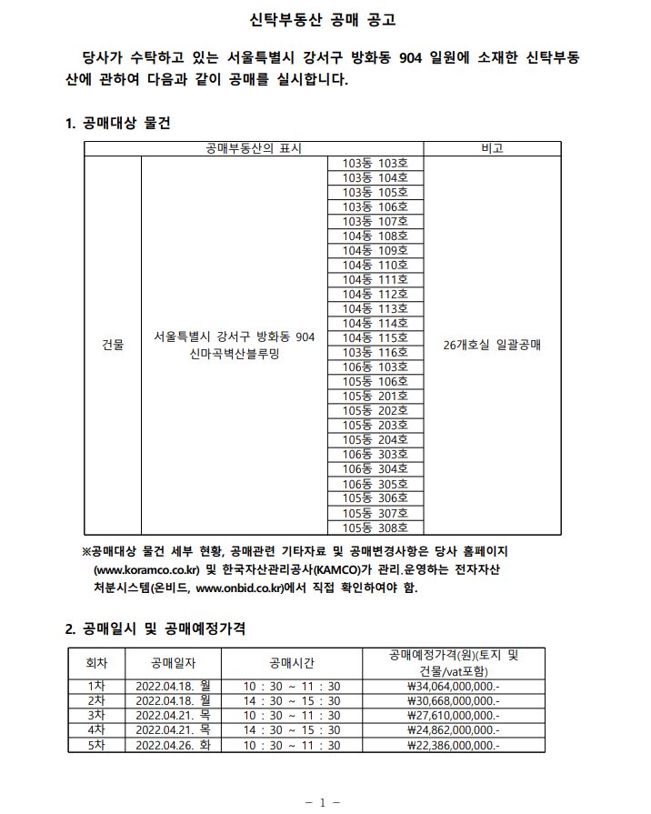 당사가 수탁중인 서울특별시 강서구 방화동 904 신마곡벽산블루밍 판매시설(상가) 26개 호실에 대한 신탁부동산 일괄공매를 다음과 같이 실시합니다.