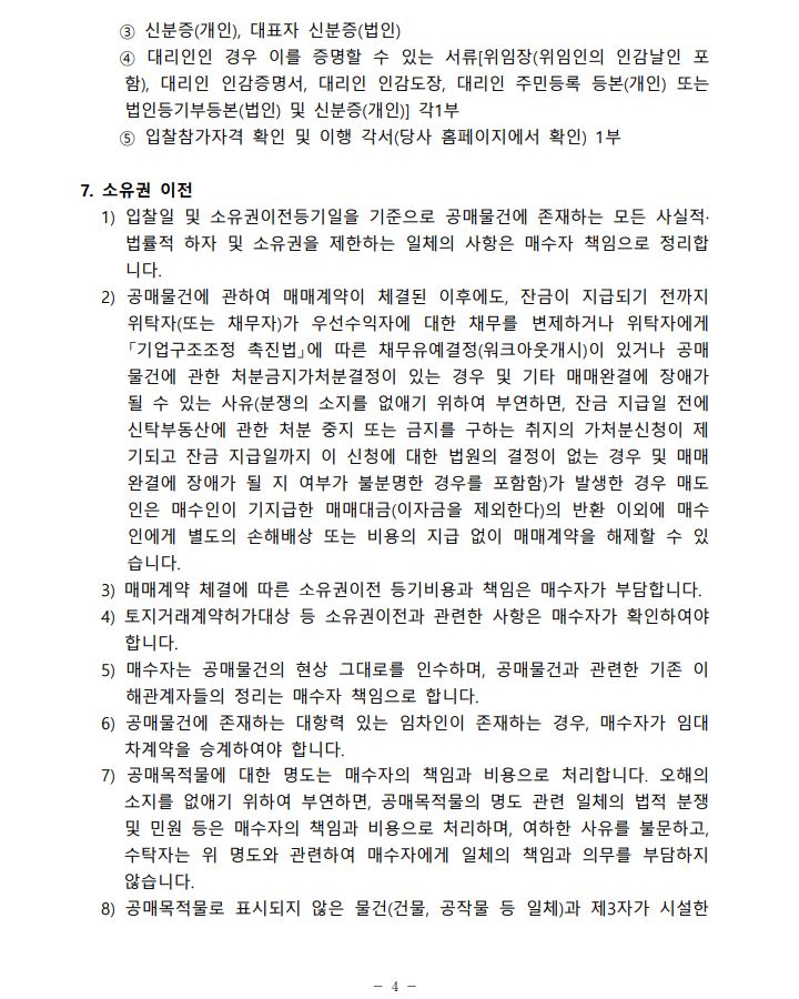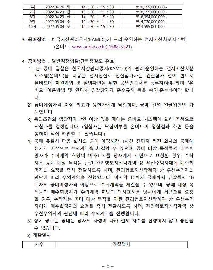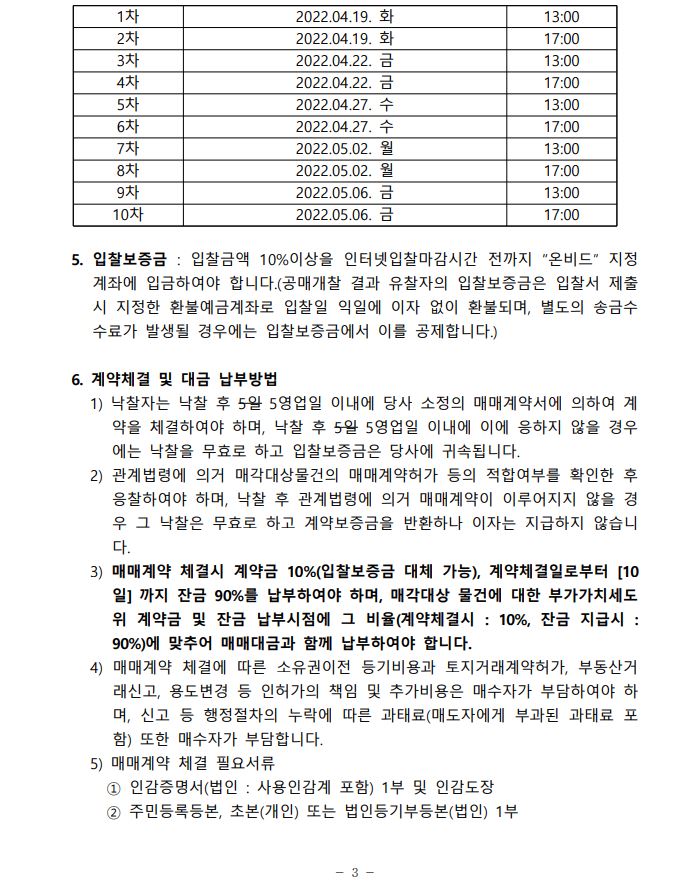 - 첨부파일의 매매계약서(안), 공매공고 및 입찰참가자 준수규칙 등을 반드시 확인하여 주시기 바랍니다.