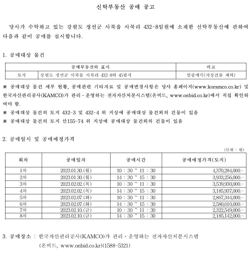 - 공매공고 및 입찰참가자 준수규칙 등을 한국자산관리공사(KAMCO)가 관리ㆍ운영하는 전자자산처분시스템(온비드, www.onbid.co.kr)에서 반드시 확인하여 주시기 바랍니다.