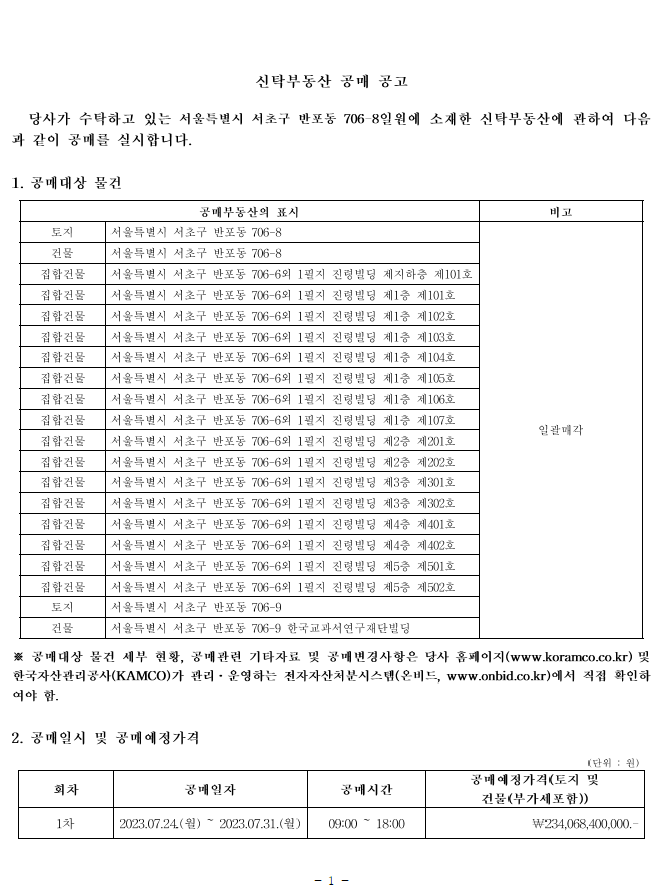 유찰 서울특별시 서초구 반포동 706-8일원에 소재한 신탁부동산 공매