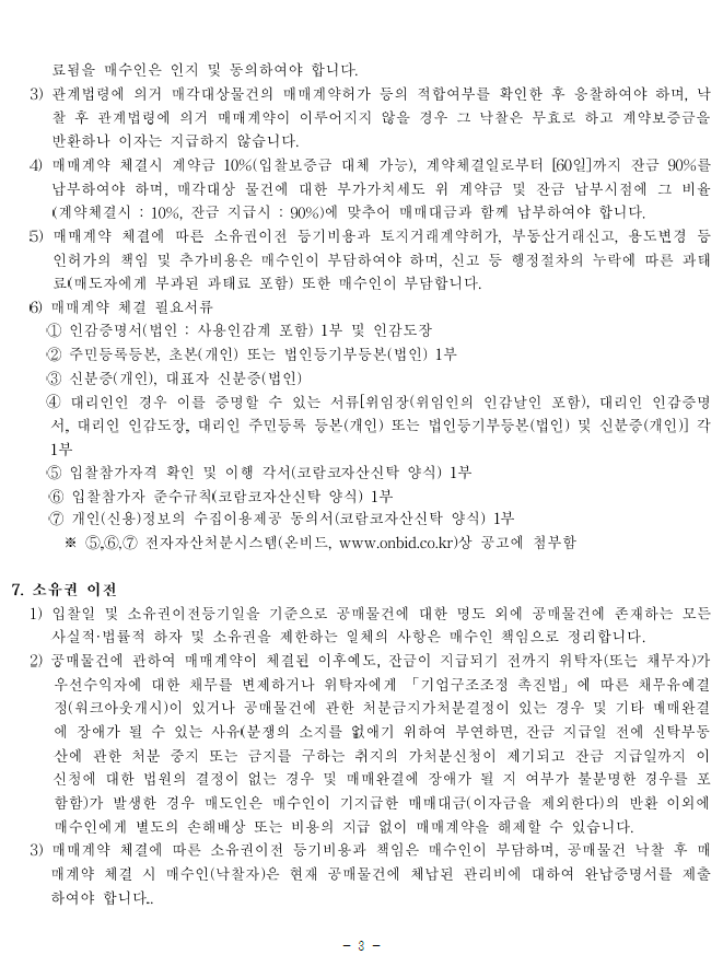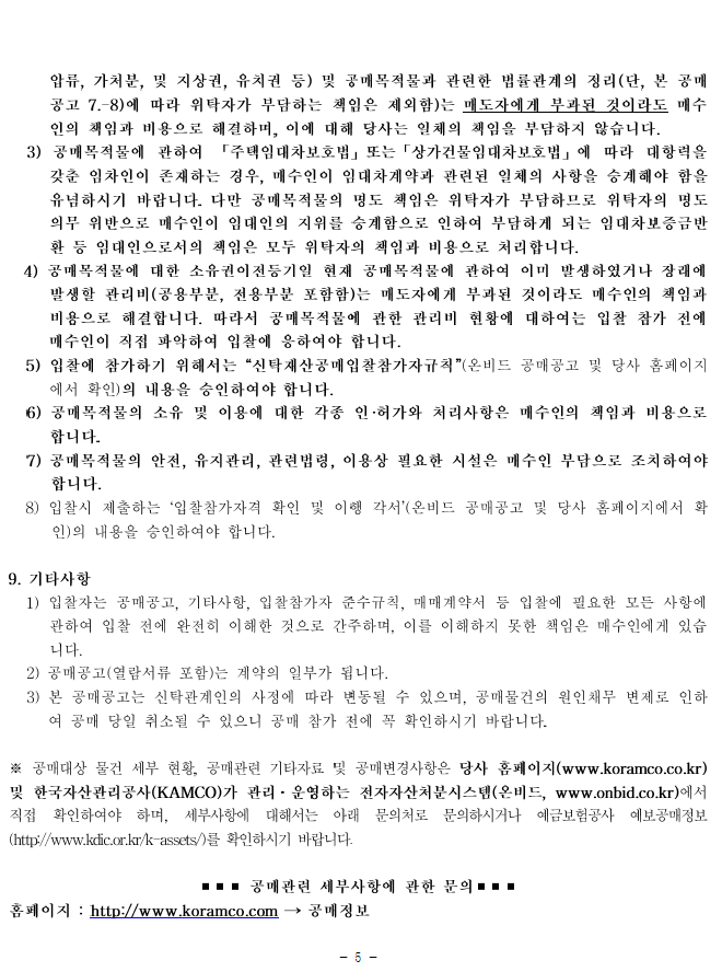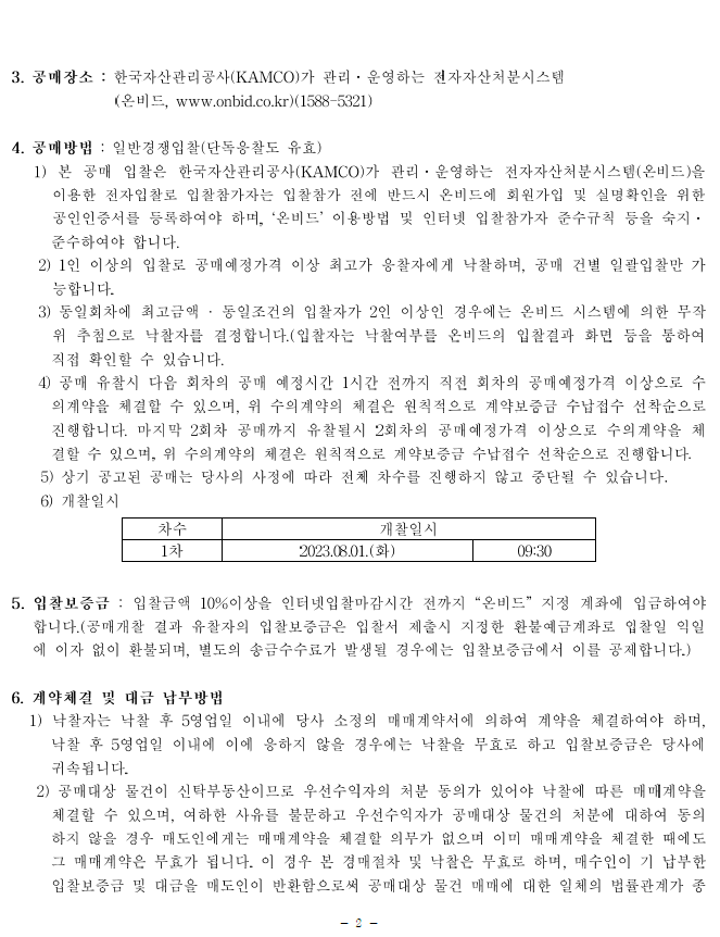 - 공매공고 및 입찰참가자 준수규칙 등을 한국자산관리공사(KAMCO)가 관리ㆍ운영하는 전자자산처분시스템(온비드, www.onbid.co.kr)에서 반드시 확인하여 주시기 바랍니다.
