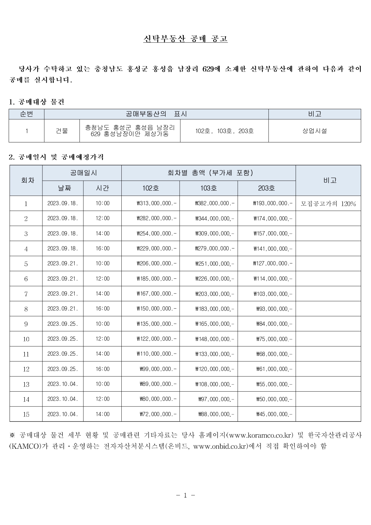 낙찰 충청남도 홍성군 홍성읍 남장리 629 홍성남장이안 단지내상가(3개 호실) 개별매각