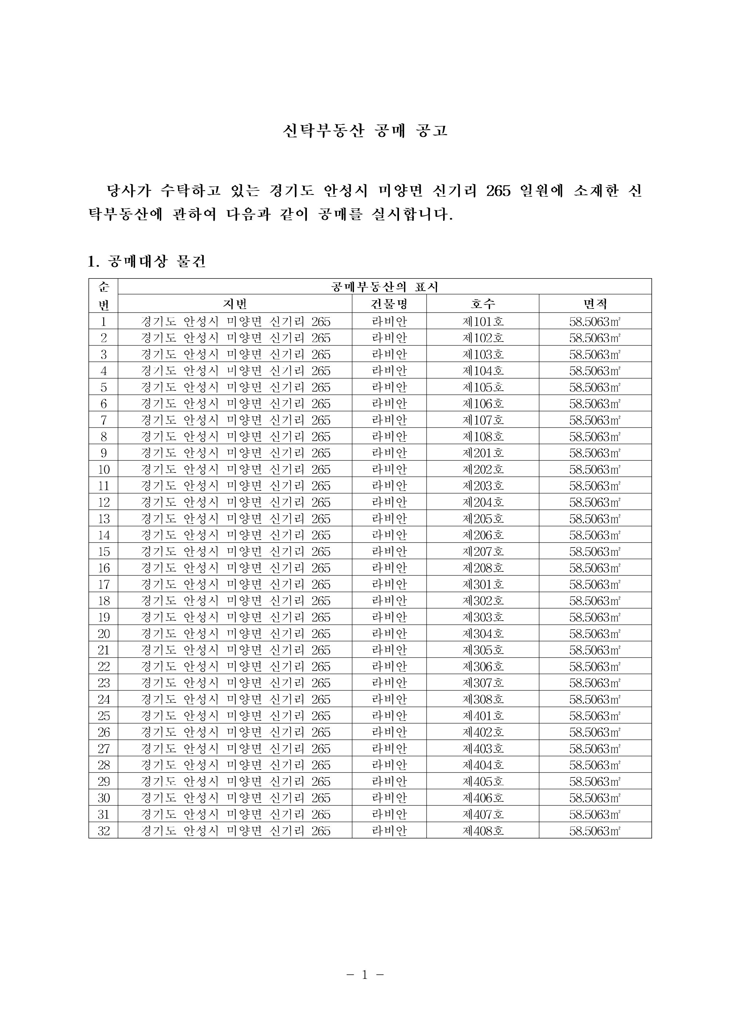 진행중 경기도 안성시 미양면 신기리 265 제101호 외 31개 호실 공매