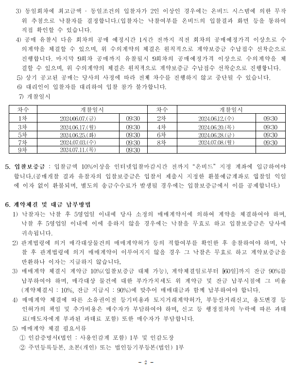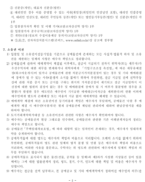 - 공매공고 및 입찰참가자 준수규칙 등을 한국자산관리공사(KAMCO)가 관리ㆍ운영하는 전자자산처분시스템(온비드, www.onbid.co.kr)에서 반드시 확인하여 주시기 바랍니다.