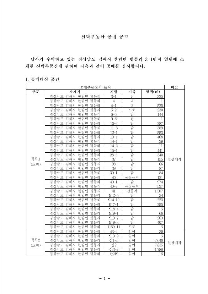 유찰 경상남도 김해시 한림면 병동리43-4 외 토지 신탁공매
