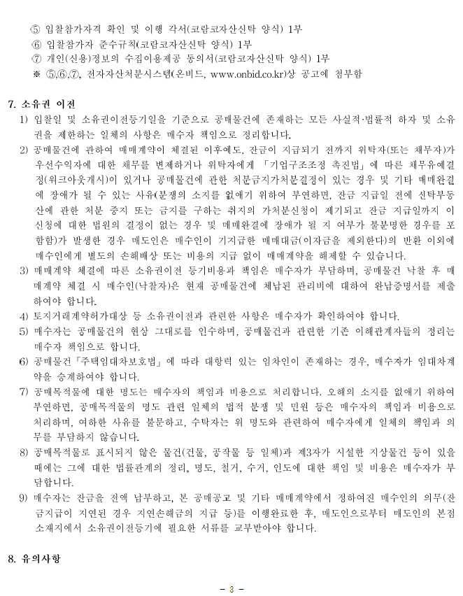 - 공매공고 및 입찰참가자 준수규칙 등을 한국자산관리공사(KAMCO)가 관리ㆍ운영하는 전자자산처분시스템(온비드, www.onbid.co.kr)에서 반드시 확인하여 주시기 바랍니다.