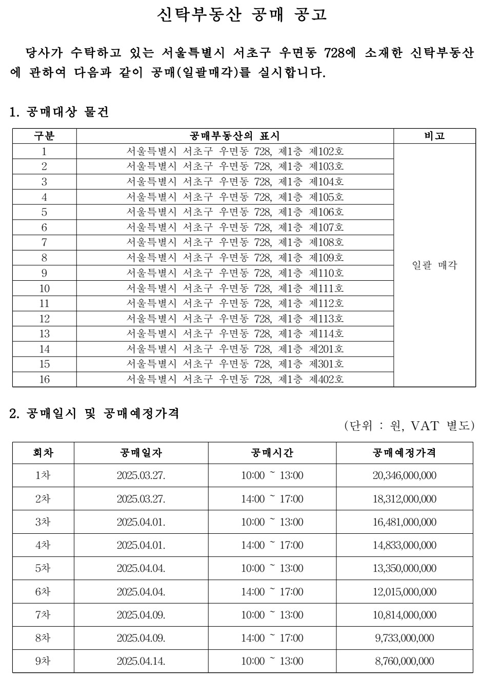 진행중 서울특별시 서초구 우면동 728, 102호외 15개호 근린생활시설 매각