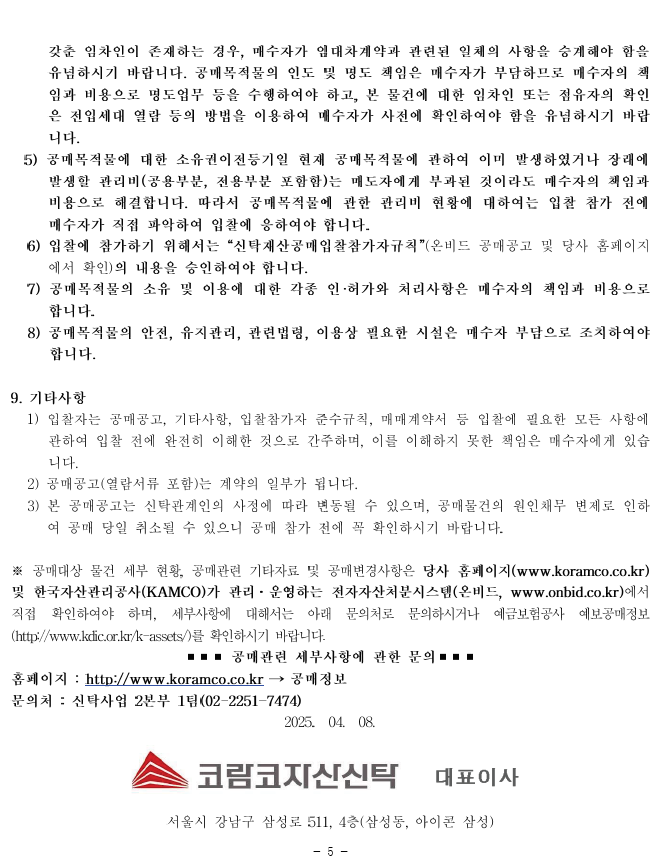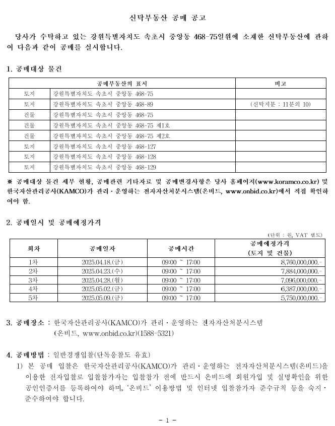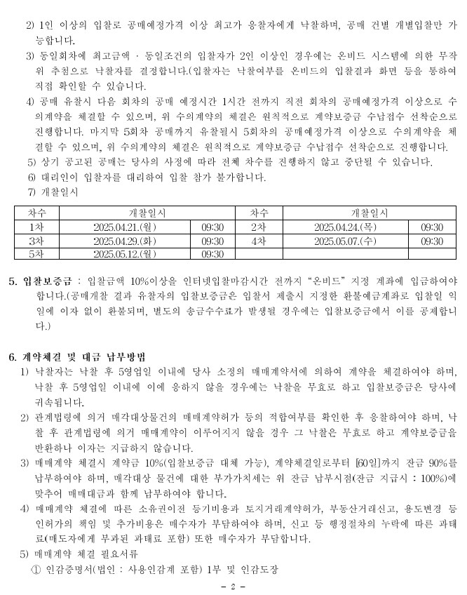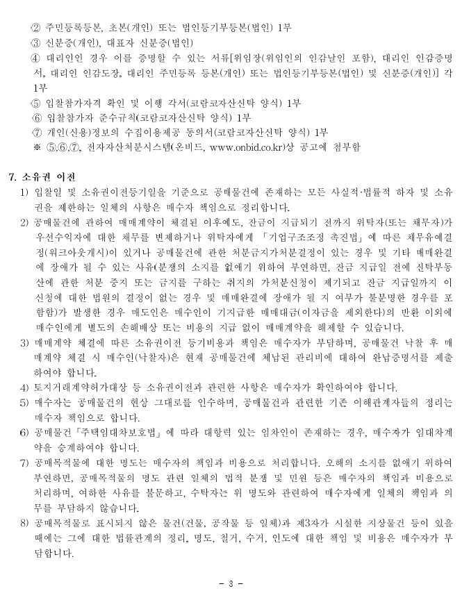 - 공매공고 및 입찰참가자 준수규칙 등을 한국자산관리공사(KAMCO)가 관리ㆍ운영하는 전자자산처분시스템(온비드, www.onbid.co.kr)에서 반드시 확인하여 주시기 바랍니다.
