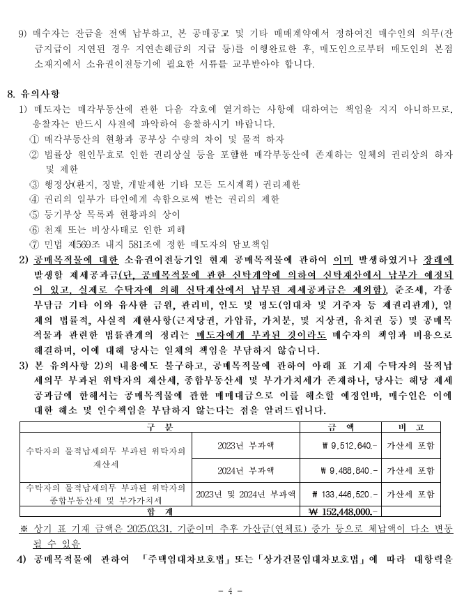※ 당사는 등기부상 최초 1회에 한하여 소유권 이전등기 업무만을 수행하고 이를 제외한 매매계약과 관련한 매도인으로서의 일체의 의무 및 책임(매매목적물의 모든 법률적·사실적 하자 또는 장애에 대한 매도인으로서의 의무 및 책임, 불법행위책임, 채무불이행책임 및 하자담보책임을 포함하되 이에 한정되지 않음)을 부담하지 않음을 안내드립니다.