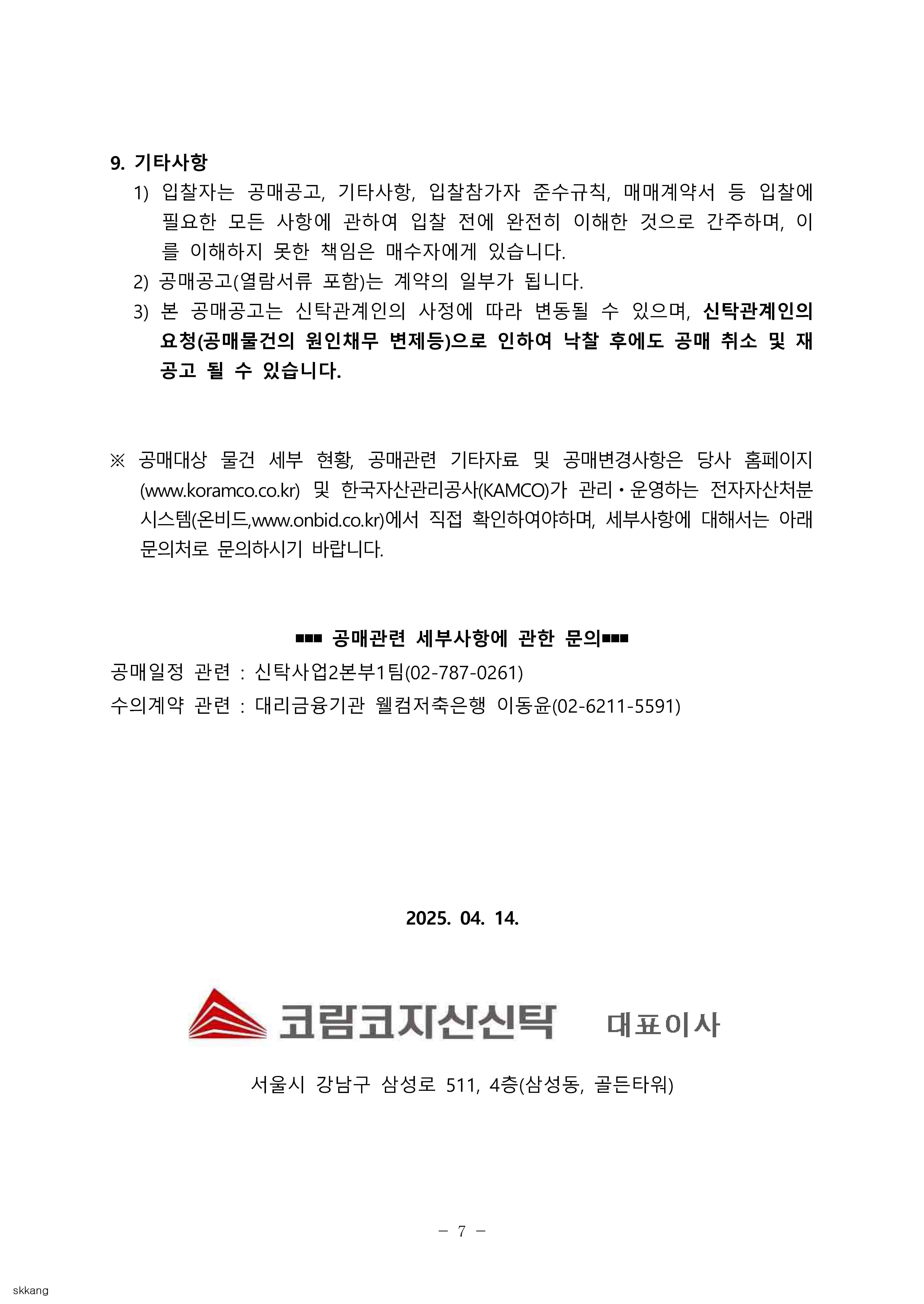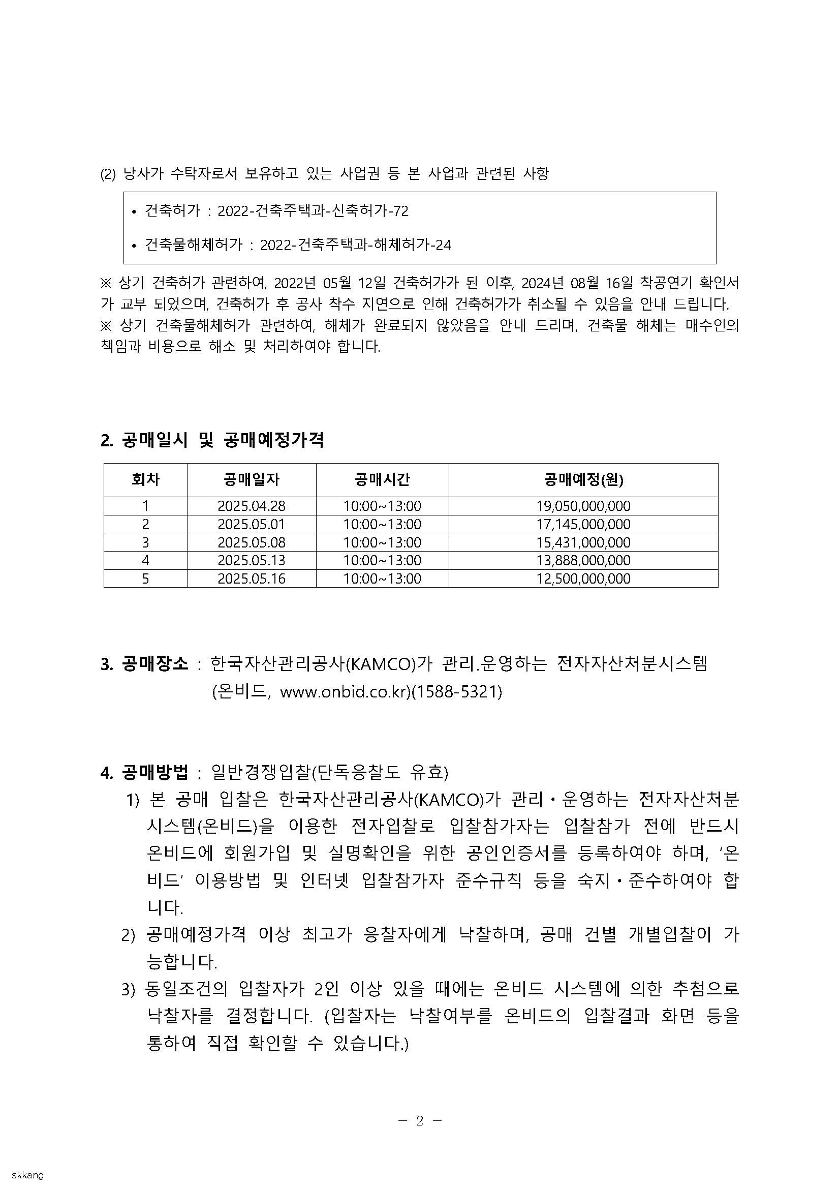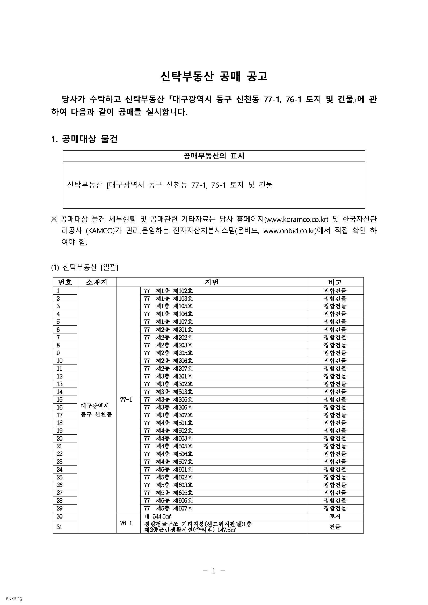 - 공매공고 및 입찰참가자 준수규칙 등을 한국자산관리공사(KAMCO)가 관리ㆍ운영하는 전자자산처분시스템(온비드, www.onbid.co.kr)에서 반드시 확인하여 주시기 바랍니다.