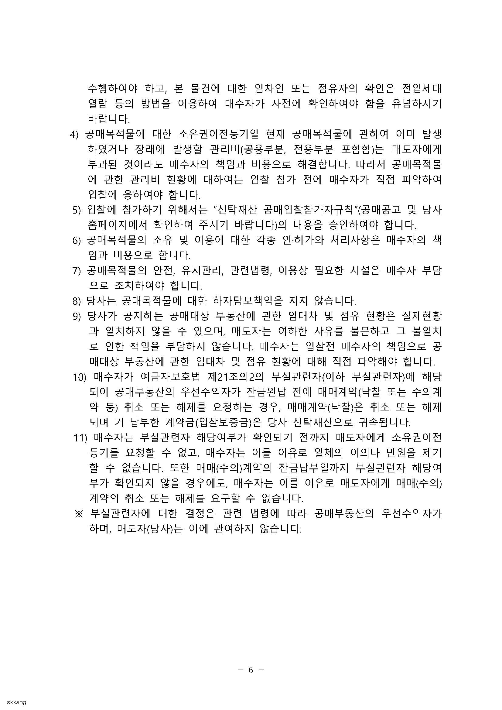 ※ 당사는 등기부상 최초 1회에 한하여 소유권 이전등기 업무만을 수행하고 이를 제외한 매매계약과 관련한 매도인으로서의 일체의 의무 및 책임(매매목적물의 모든 법률적·사실적 하자 또는 장애에 대한 매도인으로서의 의무 및 책임, 불법행위책임, 채무불이행책임 및 하자담보책임을 포함하되 이에 한정되지 않음)을 부담하지 않음을 안내드립니다.